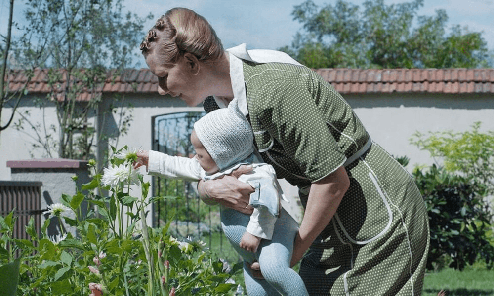 Dès les premières minutes, on découvre une jolie famille, bien allemande, dans un décor estival un peu image d’Épinal. Barbotant dans l’eau et vaquant à des activités de pique-nique et de ramassage de mûres, une belle après-midi de vacances. Mais très vite on voit la famille repartir dans des voitures noires des années 40, très marquées visuellement dans l’imaginaire historique et politique. Quand on arrive à leur maison, un personnage qui sera constant dans le film prend place dans la narration : un bruit de fond permanent, alternant vibrations et éclats ou cris ponctuels, comme une zone d’activité qui tourne à fort régime pas très loin. La nuit passe et l’on découvre à côté de quoi la maison de cette famille est placée, un camp de concentration.